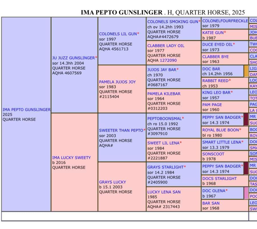 Ima Pepto Gunslinger $SOLD Sire: Ju Juzz Gunslinger Dam: Ima Lucky Sweety x Sweeter Than Pepto 2025 AQHA Bay Stallion - April 27, 2025 https://youtu.be/XlCPen93HqA - Video to watch |