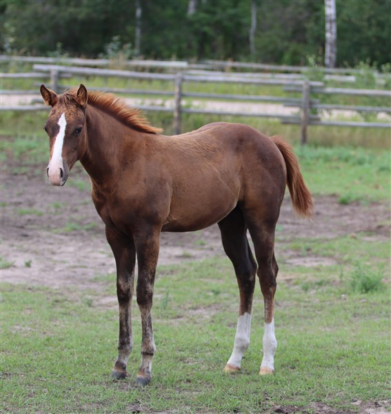 Lil Smart Gunslinger aka Juwel $NOT FOR SALE Sire: Ju Juzz Gunslinger Dam: Little Smart Cowgirl x Smart Little Lena x Doc Olena 2024 AQHA & APHA Sorrel filly - April 21, 2024 |