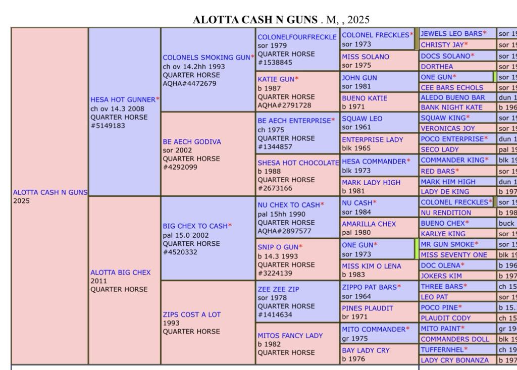 Alotta Cash N Guns $$OLD Sire: Hesa Hot Gunner Dam: Alotta Big Chex x Big Chex To Cash 2025 AQHA Sorrel Filly - April 18, 2025 https://youtu.be/qnFNKD9o8bQ - Video to watch |