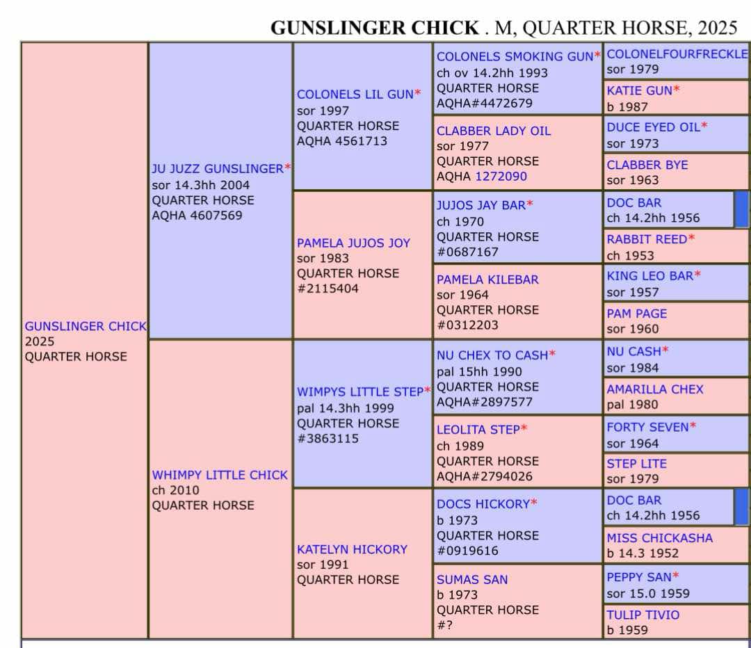 Gunslinging Chick Sire: Ju Juzz Gunslinger Dam: Whimpys Little Chick x Wimpys Little Step x Nu Chex To Cash 2023 AQHA Sorrel filly - May 19, 2023 $SOLD |